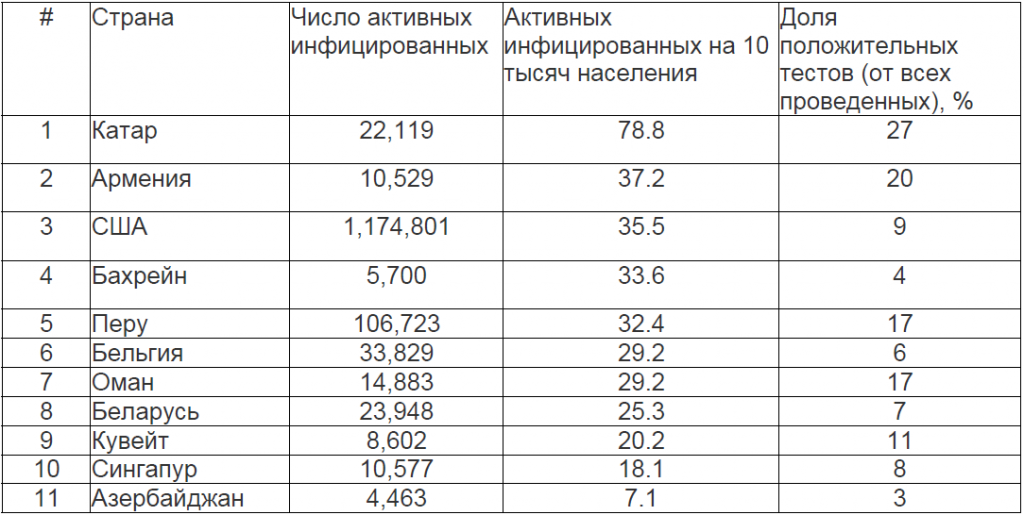 Таблица 2. Степень распространенности Covid-19 в странах мира (доля активных инфицированных)