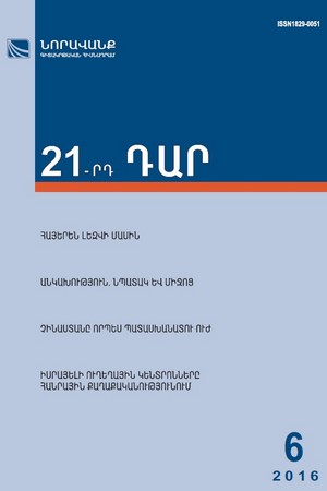 The issue of the journal features articles on variety of topics, including disturbing disputes on Eastern and Western Armenian languages, national independence, Armenia-Diaspora relations, spiritual security, and some aspects of mediatization. There are also interesting articles about China as responsible power, Israeli think tanks, economic content of competitiveness, minimum threshold for funding the science and some other issues.