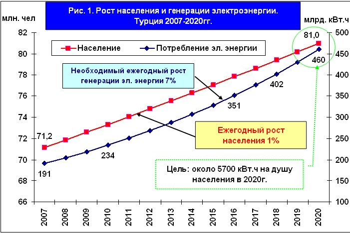 Однако чтобы обеспечить социокультурные и экономические ожидания быстро растущего молодого населения страны, необходимо поднять удельное потребление электроэнергии на душу населения до уровня порядка 5.7 тыс. кВт.ч./чел. в 2020г. – показатель, фигурирующий в ряде фундаментальных исследований, посвященных энергетической стратегии Турции (см., например, [2-4, 6]), и означающий новые рабочие места, повышение комфорта жизни, особенно в депрессивных северо-восточных и восточных вилайетах Турции. А это, согласно нашим оценкам (см. рис.1), означает ежегодный темп роста потребления электроэнергии порядка 7%, при ежегодном темпе роста населения в 1%.
