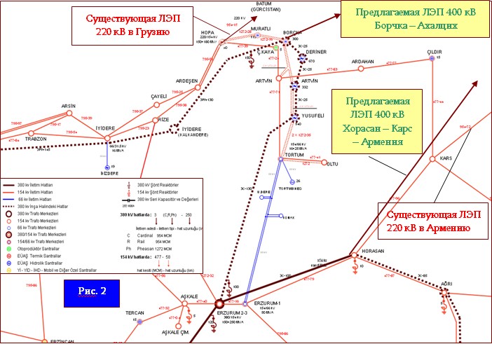 Однако вернемся к электроэнергетике. 8 апреля 2009г. в Тбилиси был подписан меморандум о взаимопонимании по проекту «Энергомост Азербайджан–Грузия–Турция». На церемонии подписания присутствовал посол США в Грузии и директор миссии USAID на Кавказе. Он объявил, что осуществляемый Азербайджаном, Грузией и Турцией проект «Энергомост» финансируется отчасти и Агентством международного развития США (USAID)9. А 19 октября 2009г. Европейский банк реконструкции и развития (EBRD) совместно с немецким банком KfW уже объявил соответствующий тендер на строительство отдельных узлов межсистемной связи Турция-Грузия по маршруту Борчка (Турция) – Ахалцха (Грузия) линией класса 400 кВ и ВПТ. На первый взгляд, все это совершенно нормальное, даже положительное развитие событий для региона. Но это только на первый взгляд.