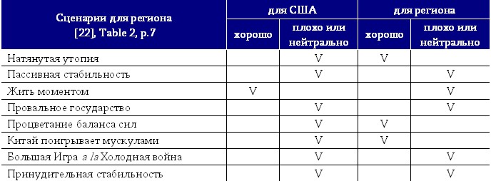 Как видим, из 8 сценариев развития событий в регионе 5 являются «плохими или нейтральными» для региона, а 7 являются таковыми для США. Ровно половина сценариев «плоха» и для региона, и для США. Единственный «хороший» сценарий для США – «Жить моментом» – является одновременно «плохим или нейтральным» для региона. Более того, все три «хороших» сценария для региона «плохи или нейтральны» для США.