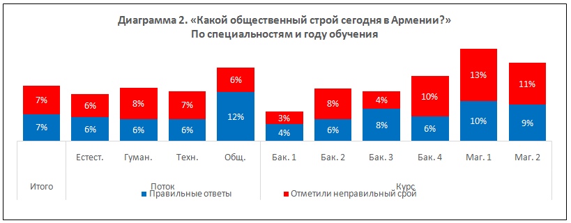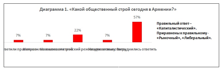 Студентам был задан вопрос: «Какой общественный строй сегодня в Армении?» Ответы не подсказывались. На вопрос правильно ответили - 7%, (правильный ответ – «капиталистический»; условно приравнены к правильному ответу также - «рыночный», «либеральный»), неправильно назвали строй – 7%;вместо строя назвали какой-либо политический режим или систему – 22%; абсолютно неадекватно ответили – 7%; затруднились ответить – 57%.