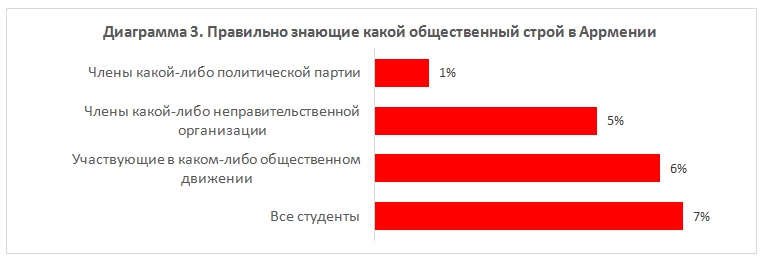 Исследование показало, что если среди всех студентов знающие какой сегодня общественный строй в Армении составляют 7%, то среди студентов участвующих в каком-либо общественном движении-6%; среди студентов членов нeправительственных организаций- 5%; а среди студентов членов какой-либо партии всего - 1%. Получается, что, партийная система Армении рекрутирует в свои ряды «отбракованный» образовательной системой «материал».