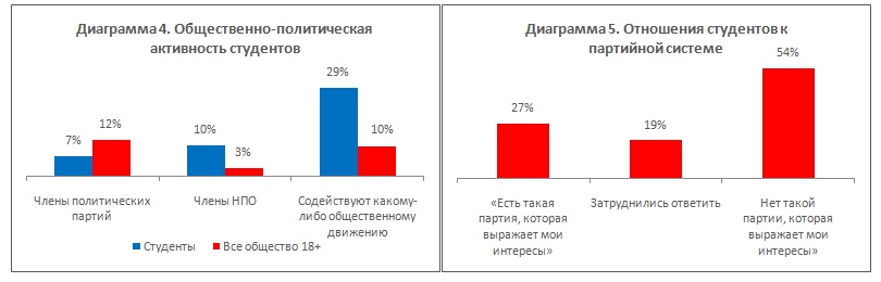 С другой стороны, членами какой-либо партии являются 7% студентов (что ниже, чем в целом по стране), членами НПО – 10% (что более, чем в 3 раза выше, чем по стране), а содействуют какому-либо общественному движению – 30% (что в 3 раза выше, чем по стране).