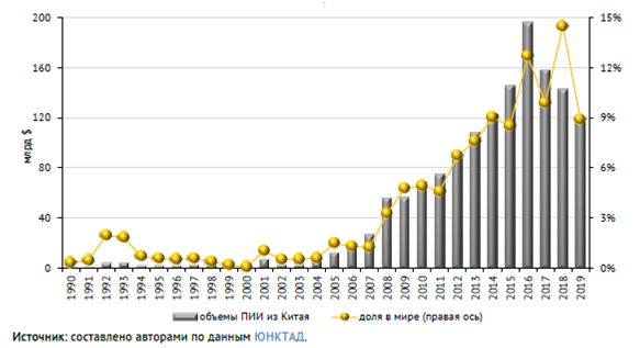 Объемы ПИИ из Китая и их доля в мировых потоках ПИИ в 1990–2019 гг.